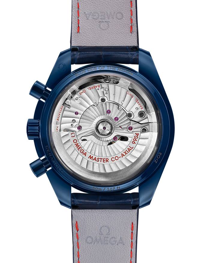 O cronógrafo de 44,25mm apresenta uma caixa em cerâmica azul complementada por uma luneta em cerâmica azul com uma escala taquimétrica em OMEGA Ceragold™. É apresentado com uma bracelete em pele azul com fecho de báscula em titânio ceramizado e cerâmica azul.