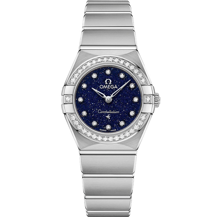 Este modelo de 25mm em aço inoxidável apresenta uma luneta com diamantes e mostrador em aventurina azul com índices em diamante. Os ponteiros, o logótipo OMEGA, a estrela Constellation e os suportes dos diamantes são em ouro branco de 18K.