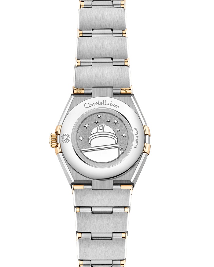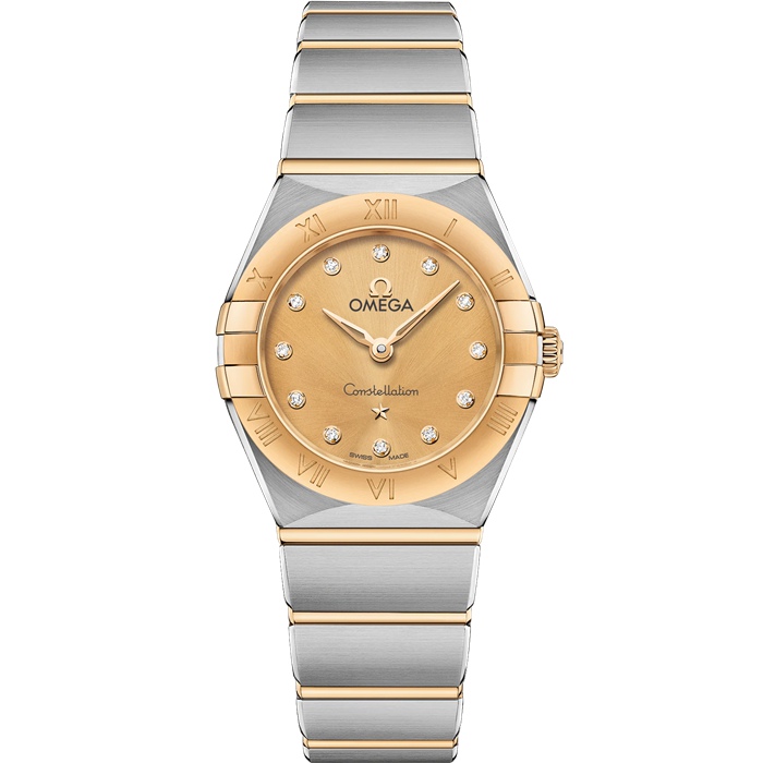Este modelo de 25mm em ouro amarelo de 18K e aço inoxidável apresenta luneta gravada com algarismos romanos, mostrador champanhe escovado, índices em diamante e vidro de safira resistente a riscos. Os ponteiros, o logótipo OMEGA, a estrela Constellation e os suportes dos diamantes também são em ouro amarelo de 18K.