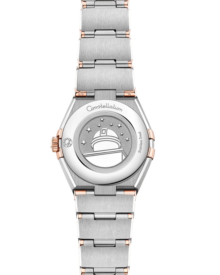 Este modelo de 25mm em ouro Sedna™ de 18K e aço inoxidável apresenta luneta gravada com algarismos romanos, mostrador castanho escovado e vidro de safira resistente a riscos. Os ponteiros, o logótipo OMEGA, a estrela Constellation e os suportes dos diamantes também são em ouro Sedna™ de 18K.