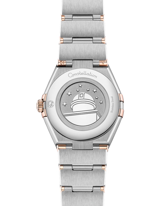 O relógio de 28 mm é apresentado com uma caixa e bracelete “mono-rang” criada a partir de aço inoxidável e ouro Sedna™ de 18K, com características icónicas do Constellation, incluindo as garras polidas, facetas em meia-lua e uma luneta com diamantes.