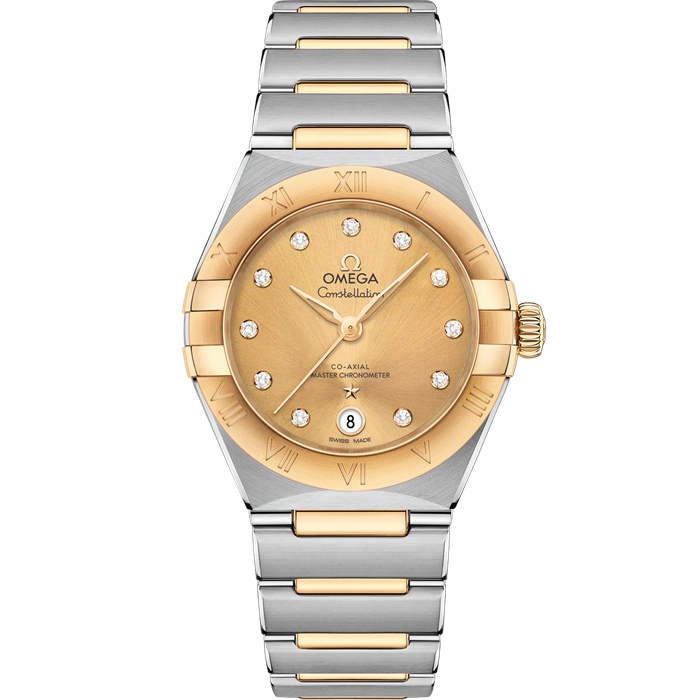 Este modelo de 29mm em ouro amarelo de 18K e aço inoxidável apresenta luneta gravada com algarismos romanos, mostrador champanhe escovado, índices em diamante e janela de data às 6horas. Os ponteiros, o logótipo OMEGA, a estrela Constellation e os suportes dos diamantes também são em ouro amarelo de 18K.