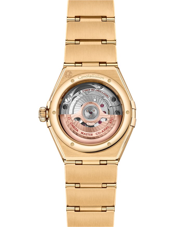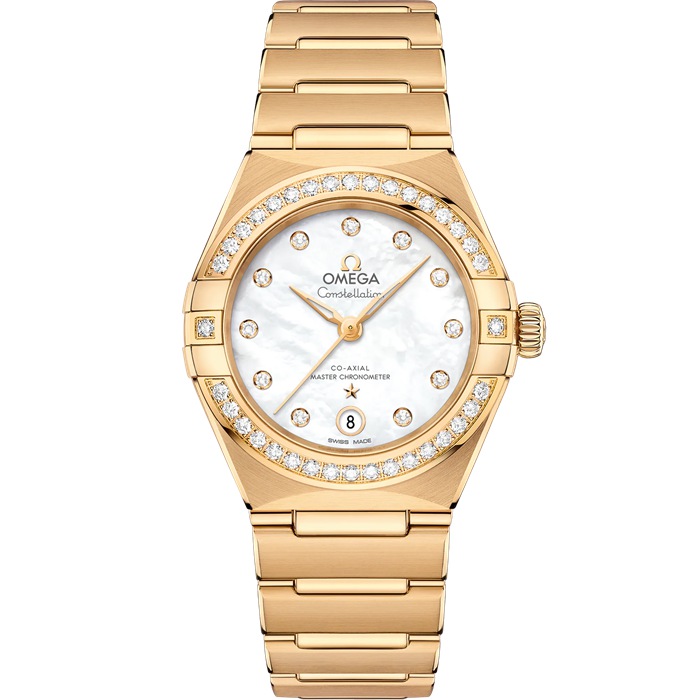 Este modelo de 29mm em ouro amarelo de 18K apresenta luneta com diamantes, mostrador em madrepérola, índices em diamante e janela de data às 6horas. A bracelete, os ponteiros, o logótipo OMEGA, a estrela Constellation e os suportes dos diamantes também são em ouro amarelo de 18K.