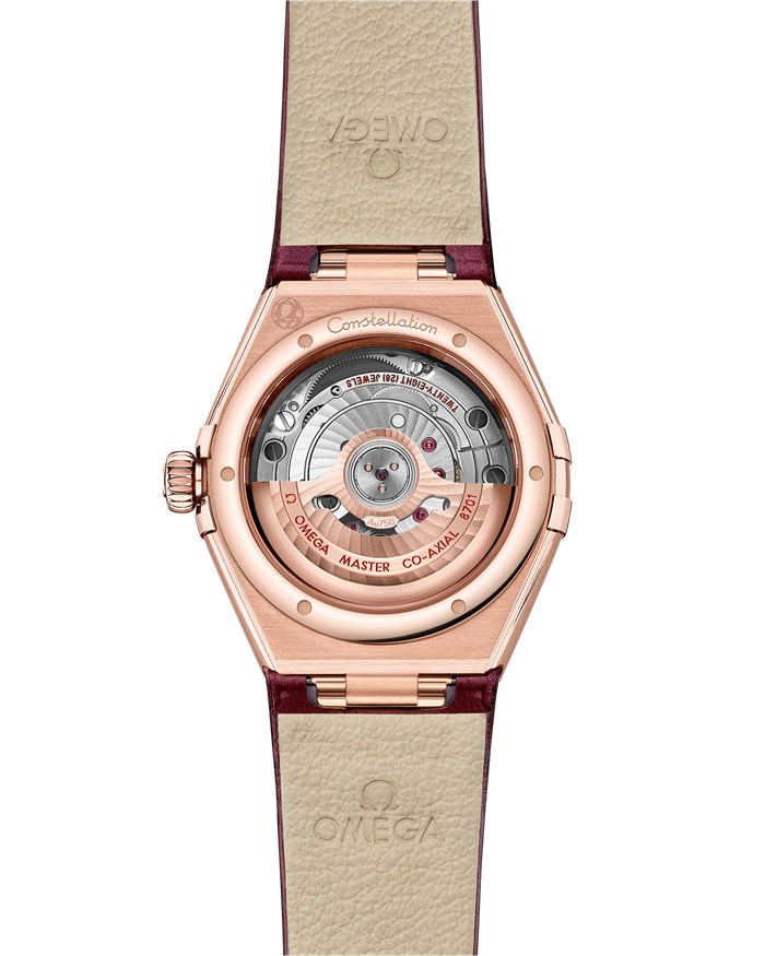 Este modelo de 29mm em ouro Sedna™ de 18K apresenta luneta com diamantes, mostrador em madrepérola, índices em diamante e janela de data às 6horas. Os ponteiros, o logótipo OMEGA, a estrela Constellation e os suportes dos diamantes também são em ouro Sedna™ de 18K.