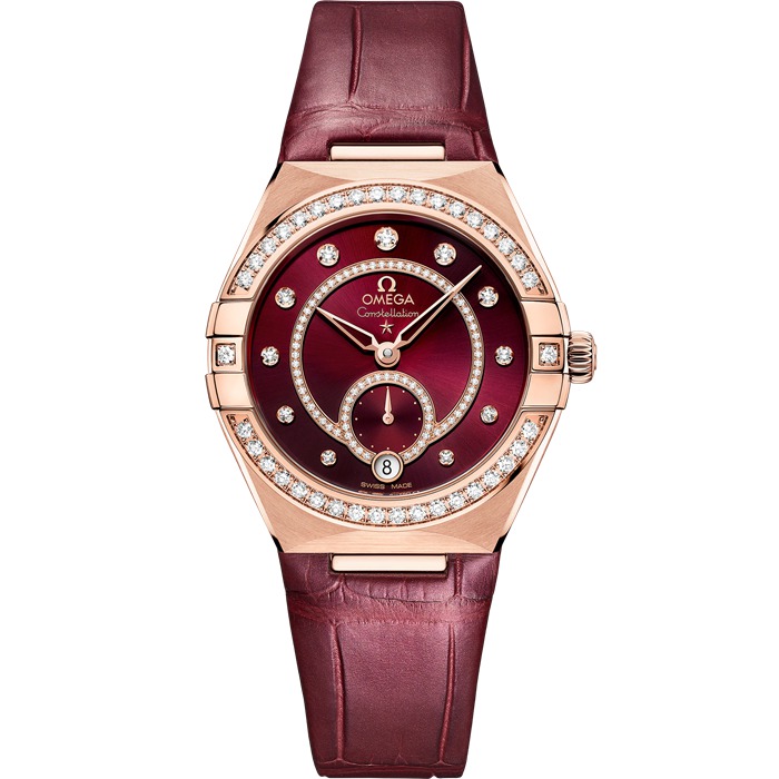 Este modelo de 34 mm em ouro Sedna™ de 18K apresenta uma luneta com diamantes, mostrador burgundy com padrão escovado e janela de data redonda às 6 horas. Os índices com diamantes incrementais são apresentados em suportes de ouro Sedna™ de 18K e os aros do submostrador de pequenos segundos e do trajeto dos minutos central também são em ouro Sedna™ de 18K com diamantes cravados.