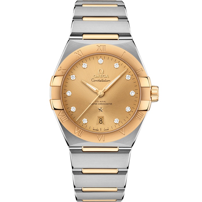Este modelo de 39 mm em aço inoxidável e ouro amarelo de 18K apresenta luneta gravada com algarismos romanos, mostrador champanhe com padrão escovado, índices de diamantes e janela de data às 6 horas. Os ponteiros, o logótipo OMEGA, a estrela Constellation e os suportes dos diamantes são todos em ouro amarelo de 18K.