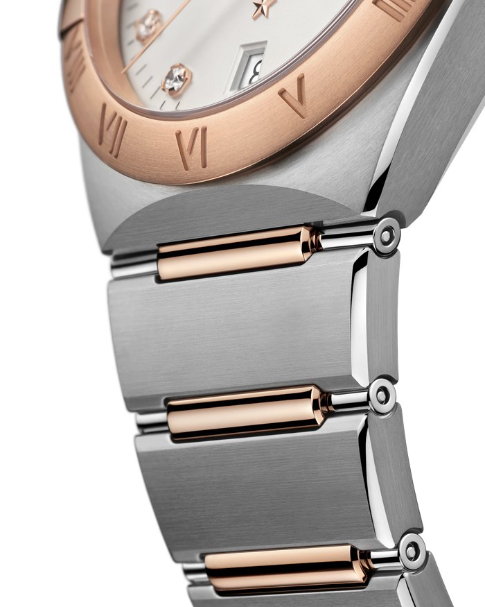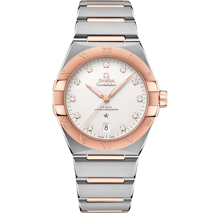Este modelo de 39 mm em aço inoxidável e ouro Sedna™ de 18K apresenta luneta gravada com algarismos romanos, mostrador branco-prateado opalino com índices de diamantes e janela de data às 6 horas. Os ponteiros, o logótipo OMEGA, a estrela Constellation e os suportes dos diamantes são todos em ouro Sedna™ de 18K.