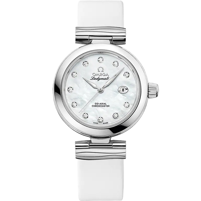 O atraente mostrador é feito em madrepérola branca para acentuar o toque feminino.