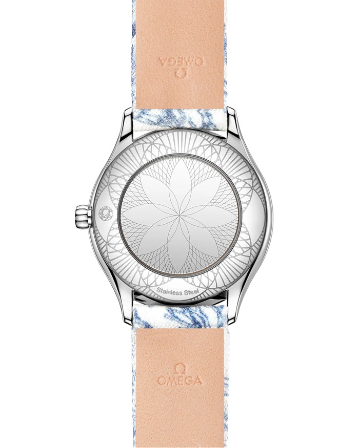 Este modelo em aço inoxidável apresenta uma caixa de 26 mm com diamantes, elegantemente curvados ao longo de cada lado. Também possui um único diamante cravado na coroa, rodeado por uma flor em cerâmica líquida vermelha. O mostrador abaulado foi concebido em esmalte “Grand Feu” branco-pérola e apresenta ponteiros revestidos a ródio polidos com diamantes e algarismos romanos decalcados em azul.
