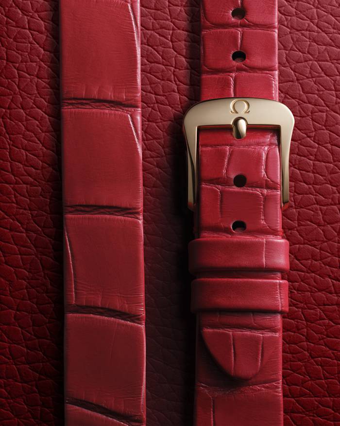 Este modelo em ouro Moonshine™ de 18K apresenta uma caixa de 26 mm com diamantes que elegantemente curvam cada lado. Contém também um único diamante cravado na coroa, rodeado por uma flor em cerâmica híbrida vermelha. O mostrador abaulado foi concebido em esmalte “Grand Feu” branco-pérola e decorado com algarismos romanos decalcados em vermelho.