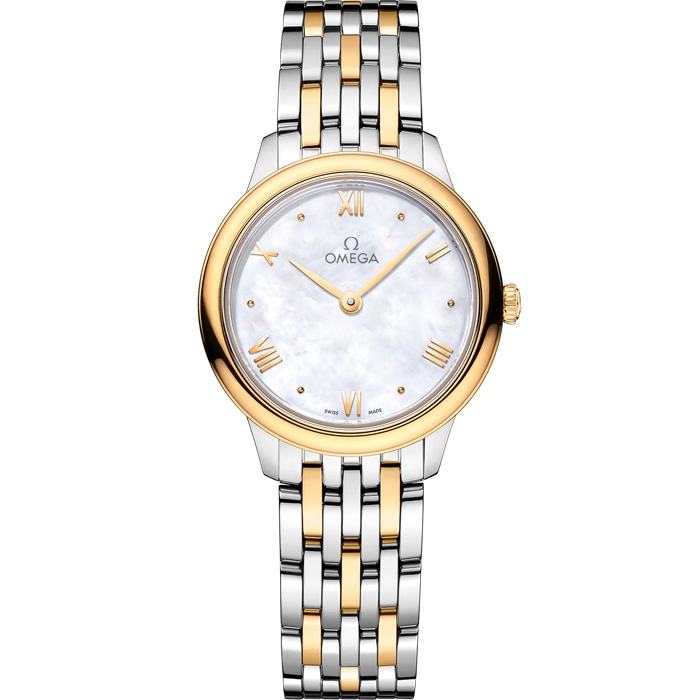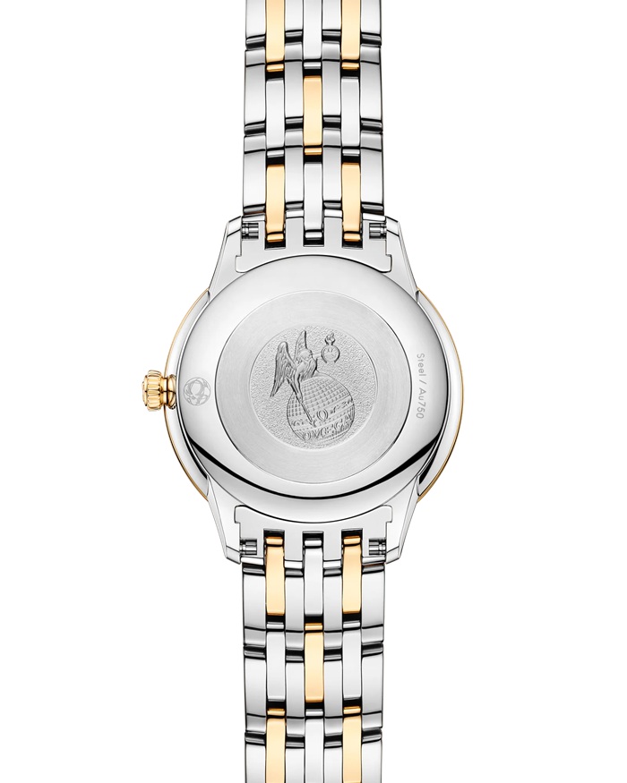 Neste modelo de 27,5 mm em aço inoxidável e ouro amarelo de 18K, o mostrador foi criado em madrepérola branca. O mostrador distingue-se pelos ponteiros revestidos a ouro amarelo, bem como pelos algarismos romanos alternados e os índices em cabochon. O aspeto simples do relógio é completado por um fundo de caixa integral com uma gravação do medalhão do Deus Chronos.