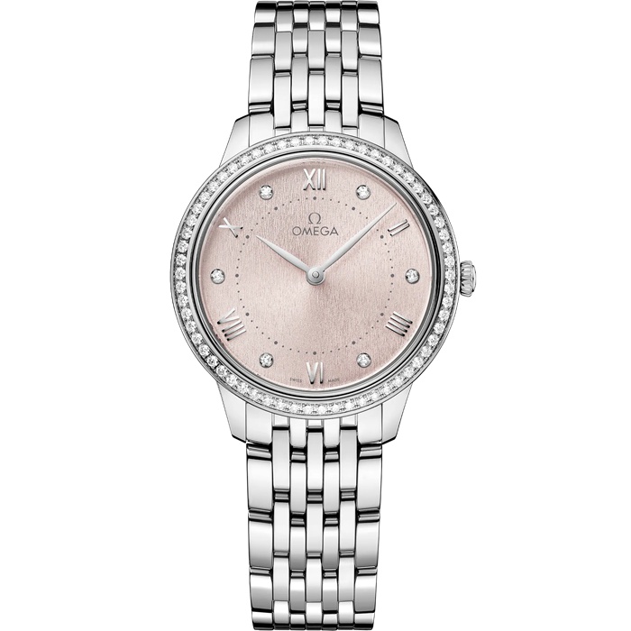 Este modelo de 30 mm em aço inoxidável apresenta uma luneta com diamantes pavé e um mostrador rosa prateado com PVD e um padrão vertical estampado num acabamento escovado. Este distingue-se pelos ponteiros revestidos a ródio, bem como pelos índices alternados em algarismos romanos e em diamante.