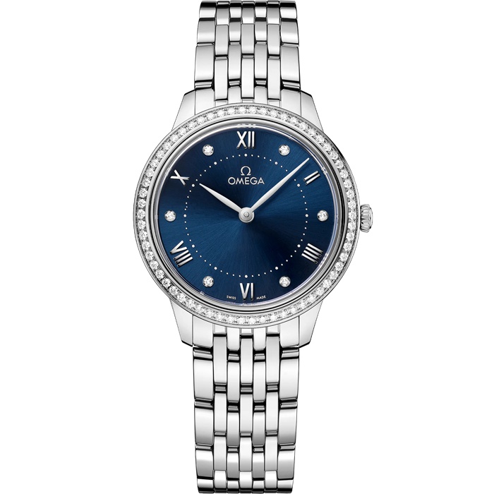 Este modelo de 30 mm em aço inoxidável apresenta uma luneta com diamantes pavé e um mostrador azul com PVD e um acabamento escovado. Este distingue-se pelos ponteiros revestidos a ródio, bem como pelos índices alternados em algarismos romanos e em diamante.
