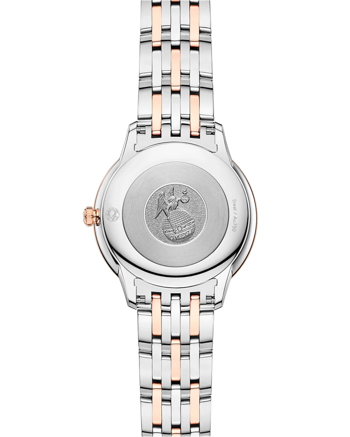 Neste modelo de 30 mm em aço inoxidável e ouro Sedna™ de 18K, o mostrador foi criado em madrepérola branca. O mostrador distingue-se pelos ponteiros coloridos em ouro Sedna™ com PVD, bem como pelos algarismos romanos alternados e os índices em cabochon.