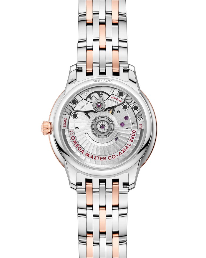 Este modelo de 34 mm em aço inoxidável e ouro Sedna™ de 18K apresenta uma luneta com diamantes pavé e um mostrador em madrepérola branca. Este distingue-se pelos ponteiros em ouro Sedna™ com PVD, bem como pelos índices alternados em algarismos romanos e em diamante com suportes em ouro Sedna™ de 18K.