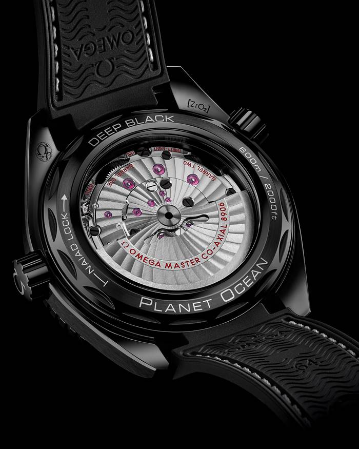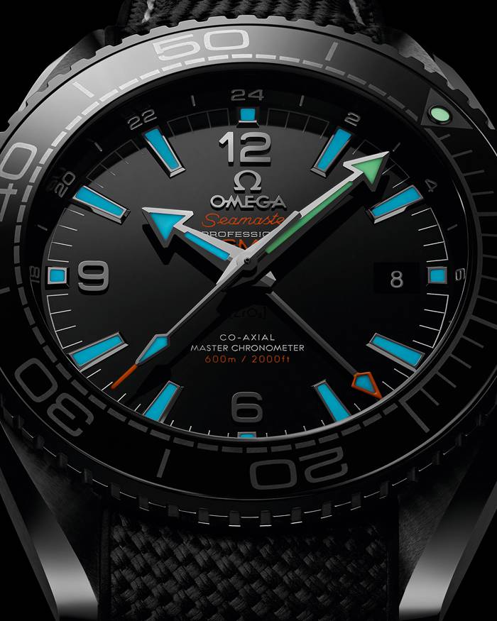 Também foi fixado um novo aro GMT no mostrador enquanto a escala de mergulho e o logótipo OMEGA na coroa foram decorados com Liquidmetal™. Os ponteiros são em ouro branco de 18K e revestidos a Super-LumiNova branca. Noutra estreia, a OMEGA criou um fundo de caixa de rosca orientado para que as palavras gravadas adotem uma posição aprazível. Isto foi conseguido através da nova cerâmica patenteada Naiad Lock da OMEGA.