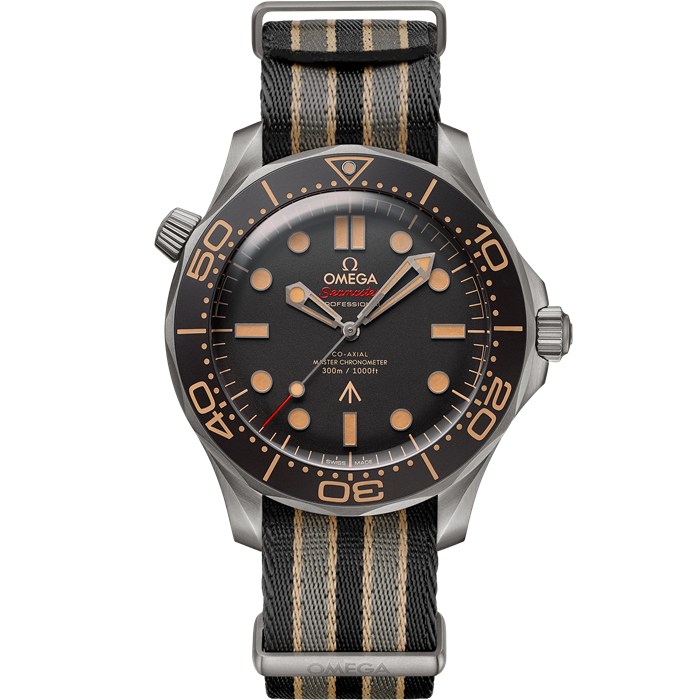 Ligeiramente mais fino do que os modelos Diver 300M normais, graças ao acabamento abaulado do vidro de safira, é apresentado com uma bracelete NATO às riscas em castanho, cinzento e bege com 007 gravado na presilha em titânio.