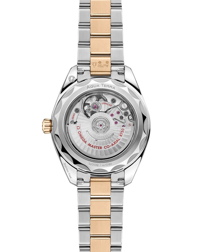 O relógio é apresentado com uma bracelete integrada em aço inoxidável e ouro Moonshine™ de 18K com elos arredondados polidos e escovados, um fecho de báscula tipo borboleta e o sistema de ajuste fácil e confortável da OMEGA.