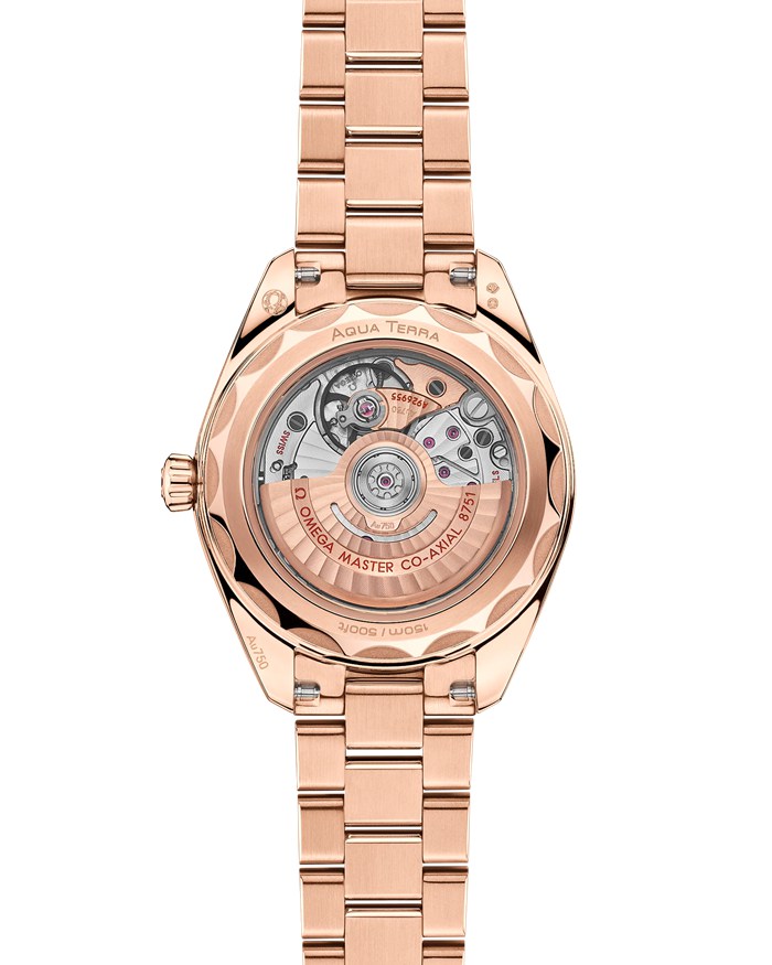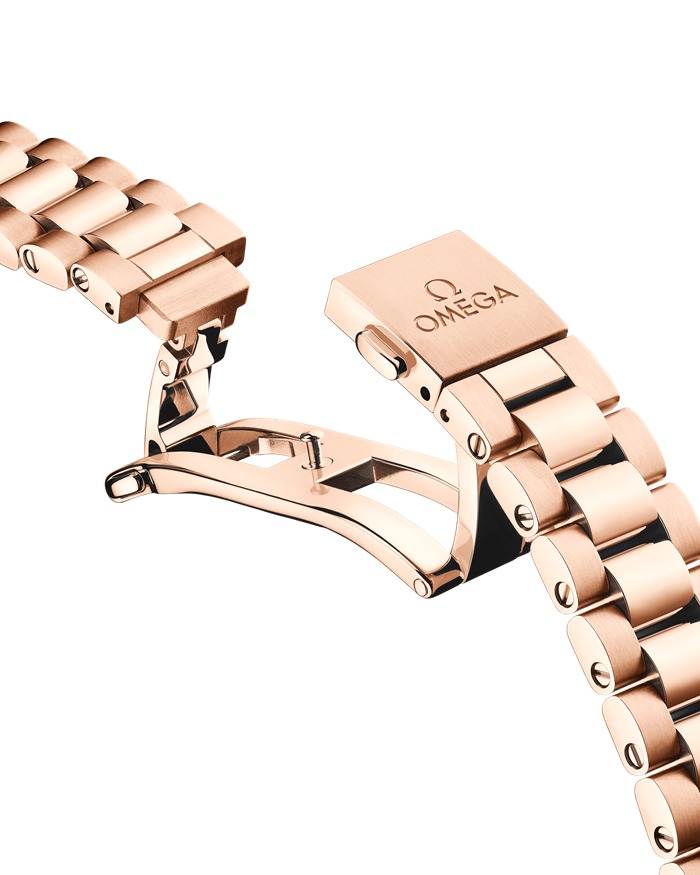 O relógio é apresentado com uma bracelete ouro Sedna™ de 18K com elos arredondados e escovados, um fecho de báscula tipo borboleta e o sistema de ajuste fácil e confortável da OMEGA.