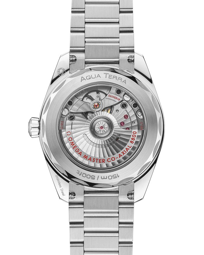 O Seamaster Aqua Terra é uma magnífica homenagem ao extenso legado marítimo da OMEGA. Este modelo de 38 mm apresenta uma caixa simétrica e uma coroa em aço inoxidável polido e um design com orlas onduladas na parte de trás.