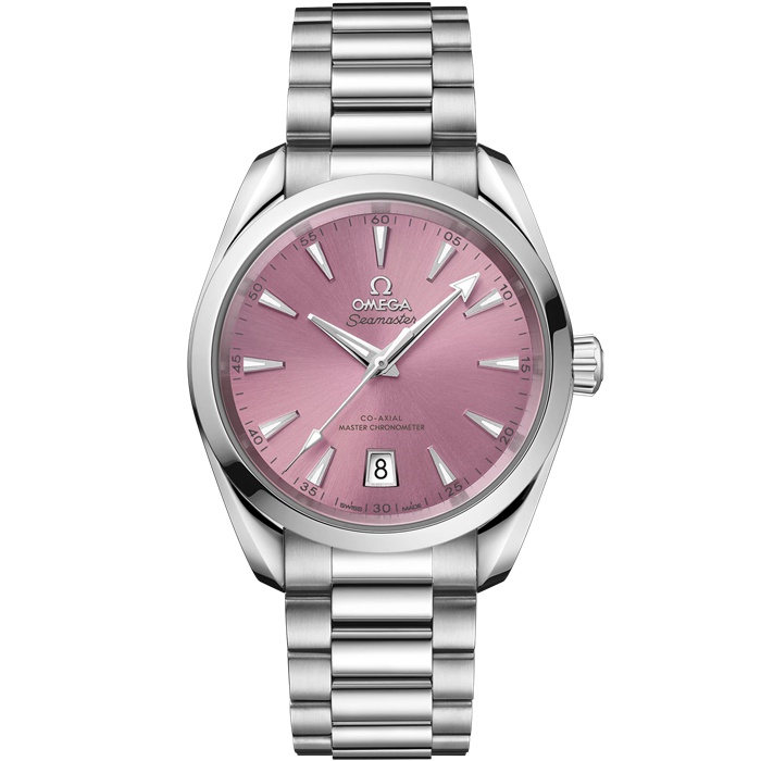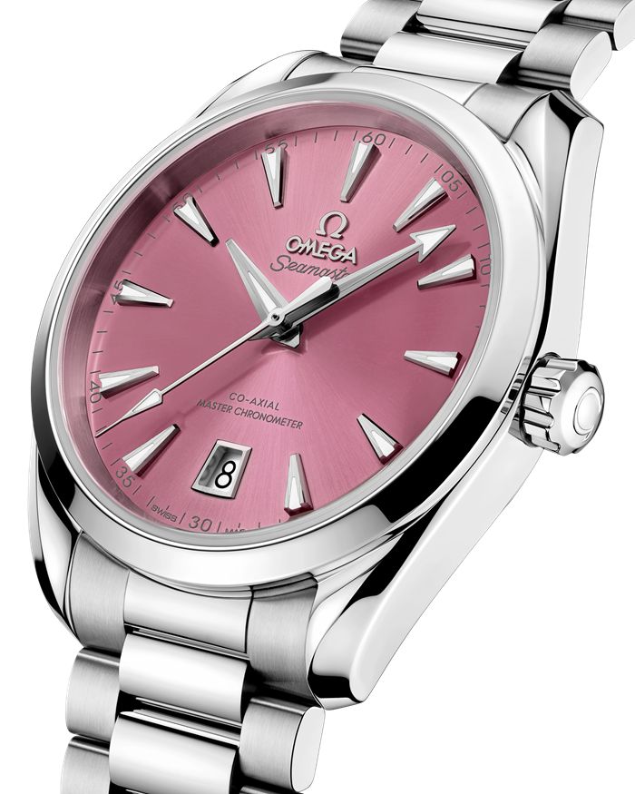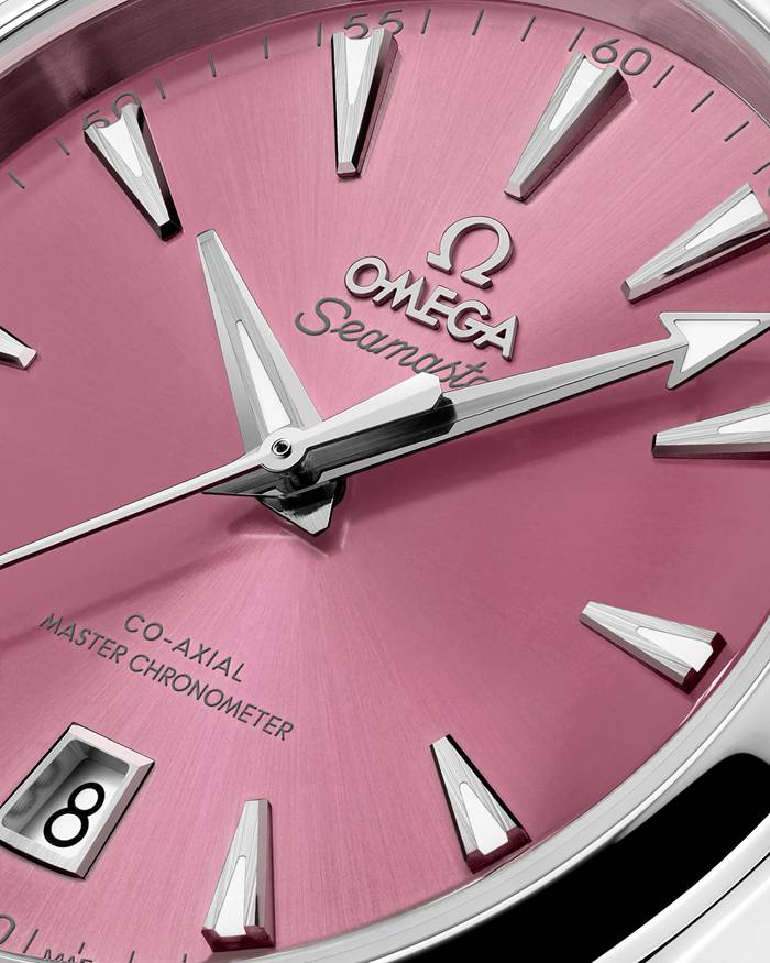 O mostrador rosa pálido, concebido a partir de latão, é lacado e apresenta um padrão escovado a partir do centro. Inclui uma janela de data às 6horas e ponteiros e índices revestidos a ródio, preenchidos com Super-LumiNova branca.