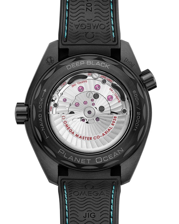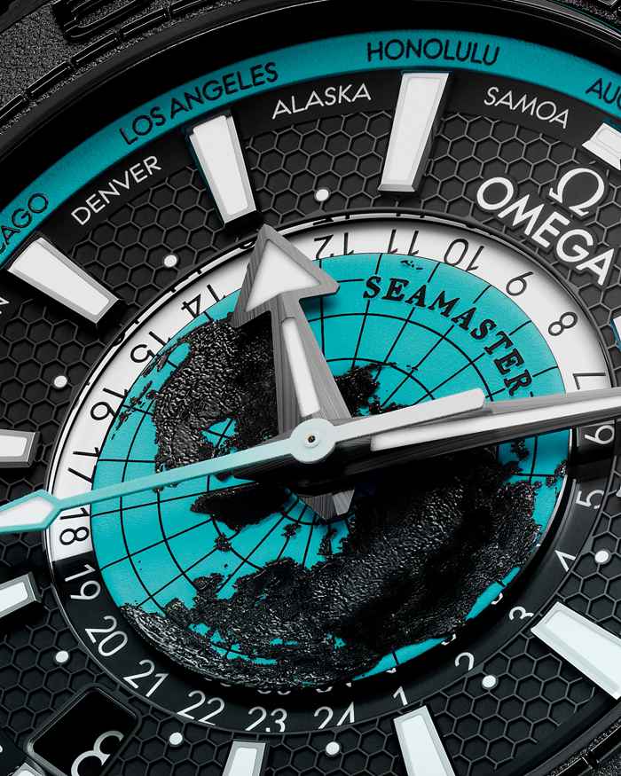 A secção exterior do mostrador é produzida em DLC preto com ablação a laser e um padrão favo de mel polido. Inclui índices escovados com diamantes preenchidos com Super-LumiNova branca e um anel exterior em verniz turquesa. Uma variedade de destinos do mundo circula o mostrador e o seu anel exterior, incluindo Bienne, a cidade natal da OMEGA, sendo que os ponteiros revestidos a PVD cinzento também incluem Super-LumiNova branca.