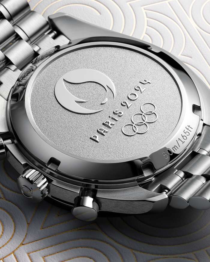 No verso, o fundo da caixa comemorativo em aço inoxidável revela um medalhão estampado com uma base fosca, com o logótipo Paris 2024 espelhado e polido, juntamente com as palavras estampadas “Paris 2024” e os anéis olímpicos.