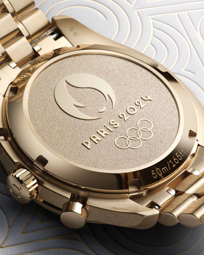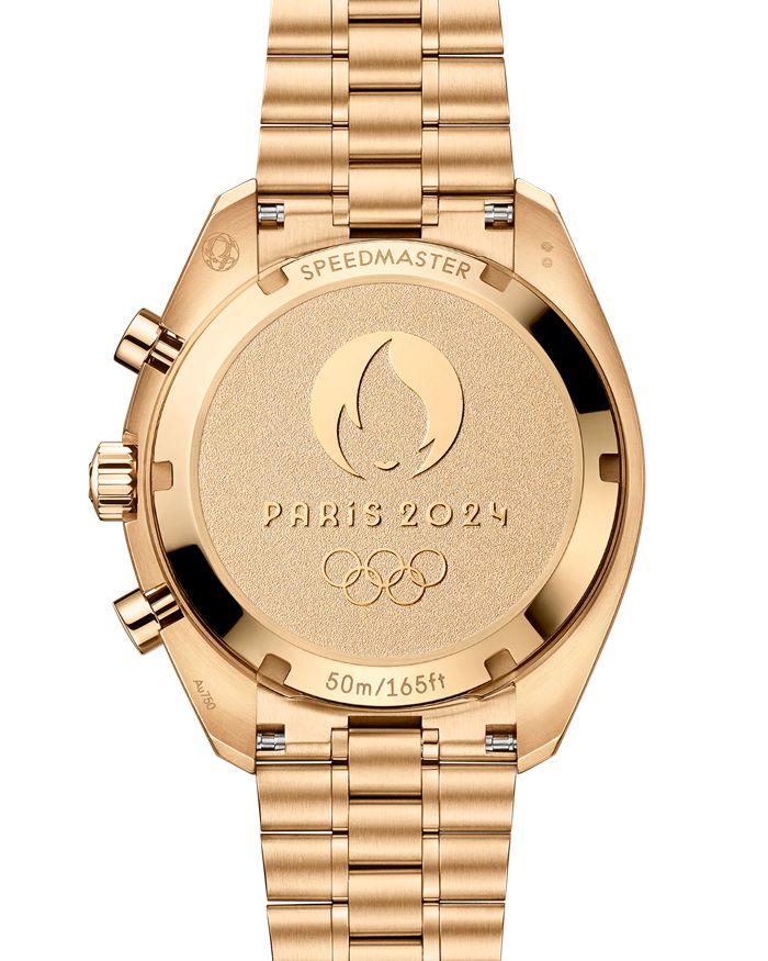 No verso, o fundo da caixa comemorativo em ouro Moonshine™ de 18K revela um medalhão estampado com uma base fosca, com o logótipo Paris 2024 espelhado e polido, juntamente com as palavras estampadas “Paris 2024” e os anéis olímpicos.