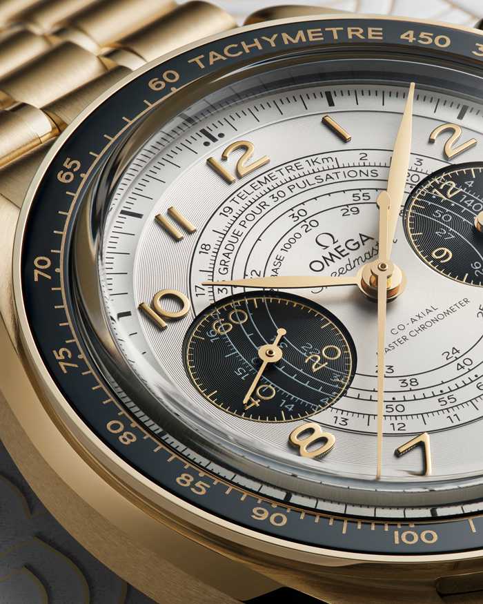 Este modelo de 43 mm é uma homenagem aos Jogos Olímpicos de Paris 2024 e apresenta as três cores principais do evento: ouro, preto e branco. O relógio é fabricado em ouro Moonshine™ de 18K com um mostrador opalino branco prateado e submostradores escurecidos. As características adicionais incluem uma luneta em cerâmica preta com escala taquimétrica em OMEGA Ceragold™, algarismos árabes em ouro Moonshine™ de 18K e ponteiros em forma de folha e ponteiros do submostrador com tratamento PVD em ouro Moonshine™.