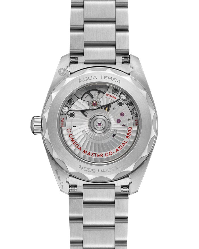 O Seamaster Aqua Terra é uma magnífica homenagem ao extenso legado marítimo da OMEGA. Este modelo de 38 mm apresenta uma caixa simétrica concebida em aço inoxidável com um design com orlas onduladas na parte de trás.