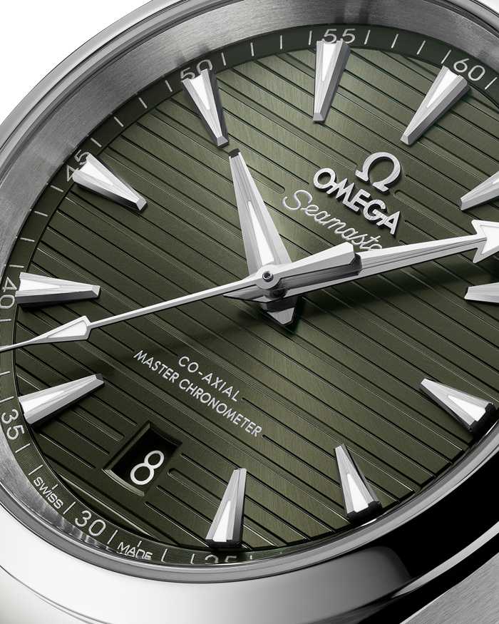 O mostrador verde em PVD com padrão escovado distingue-se pelo padrão “teak” horizontal, inspirado no convés de madeira dos veleiros de luxo. Possui também uma janela de data às 6 horas e ponteiros e índices revestidos a ródio, preenchidos com Super-LumiNova branca.