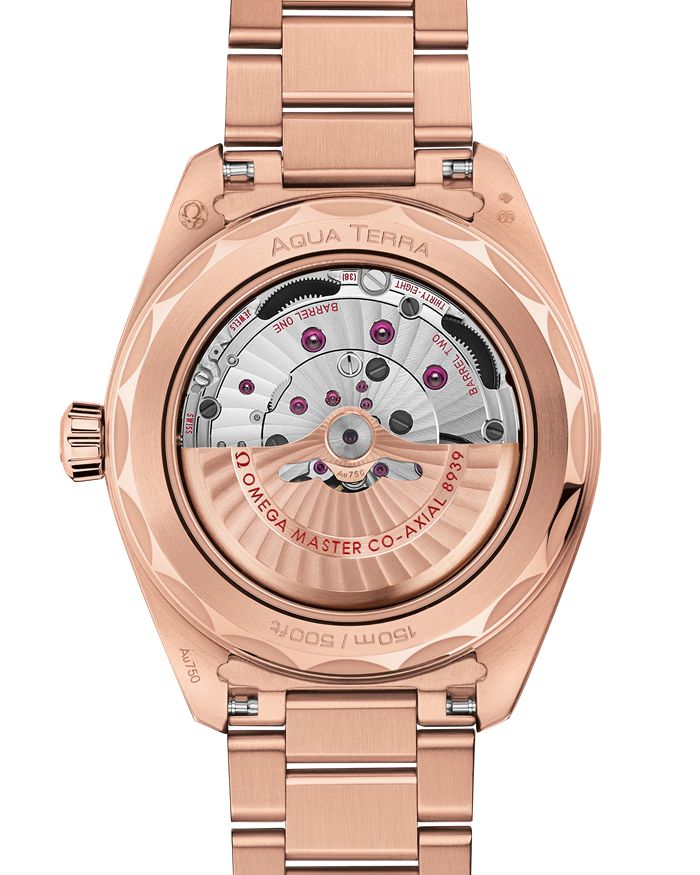 A secção exterior do mostrador opalino-prateado inclui riscas “teak” verticais e um círculo com destinos de todo o mundo impressos a vermelho (GMT), azul (+1h no verão) e na tonalidade do ouro Sedna™ (locais sem horário de verão).
