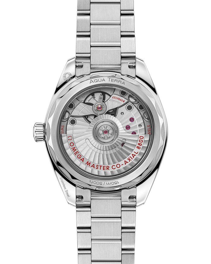 O Seamaster Aqua Terra é um magnífico tributo à rica herança marítima da OMEGA. Este modelo de 34 mm apresenta uma caixa simétrica e uma coroa em aço inoxidável polido e um design com orlas onduladas na parte de trás.
