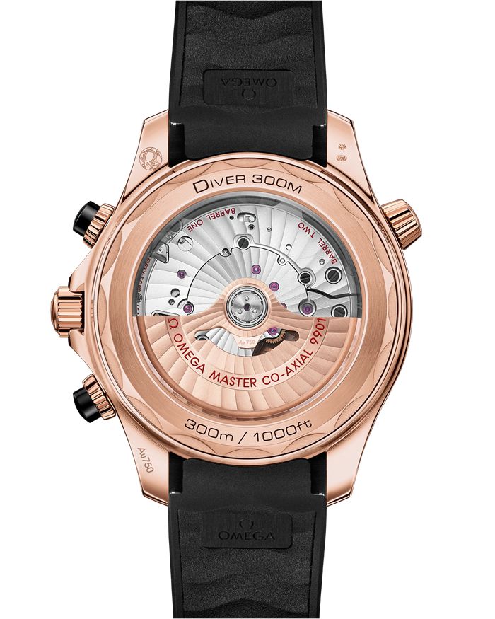 Este modelo cronógrafo de 44mm foi criado em ouro Sedna™ de 18K e inclui uma luneta em cerâmica preta esculpida a laser com uma escala de mergulho polida. Os botões também são em cerâmica preta polida, tal como o mostrador, que apresenta um padrão de ondas gravado a laser em alto-relevo e uma janela de data às 6horas.