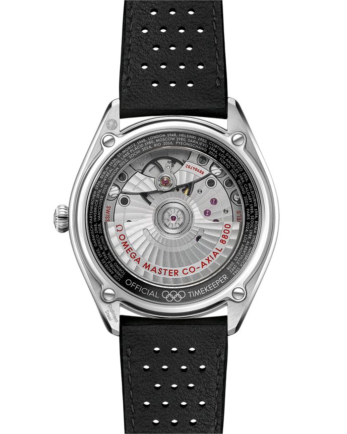 No fundo de caixa, há um aro em alumínio anodizado preto que inclui todas as cidades anfitriãs e datas conhecidas da viagem olímpica da OMEGA, de Los Angeles 1932 até Los Angeles 2028.