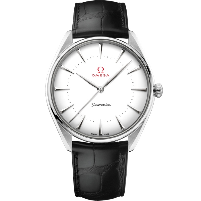 Este modelo de 39,5mm apresenta uma caixa em Canopus Gold™ de 18K e uma bracelete em pele preta. O mostrador abaulado é em esmalte branco casca de ovo claro, com um inconfundível logótipo OMEGA vintage, trajeto dos minutos e a palavra “Seamaster” também em esmalte. Os ponteiros estilo “folha” e os índices aplicados são em ouro branco de 18K.