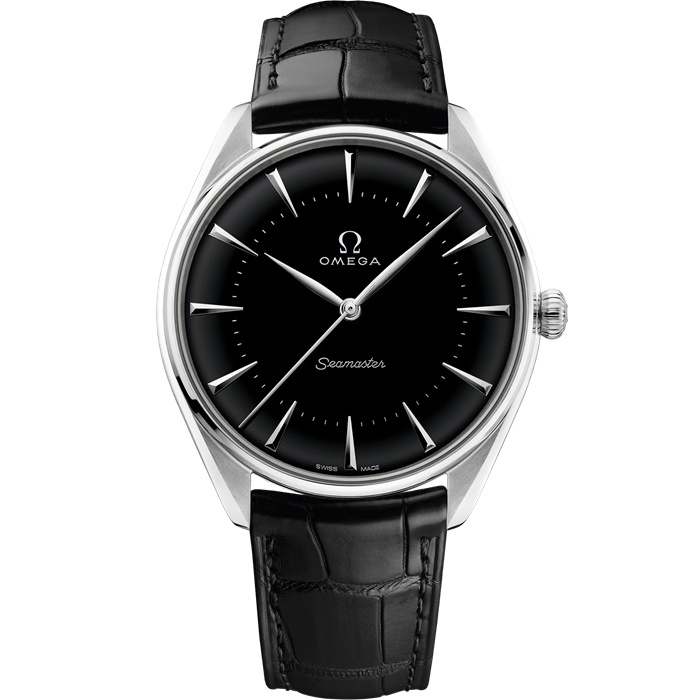 O modelo de 39,5mm apresenta uma caixa fabricada numa liga exclusiva, com 95% de platina e 2% de ouro de 18K. O mostrador abaulado é em esmalte preto e inclui marcações em platina para o trajeto dos minutos, um logótipo OMEGA vintage e a palavra “Seamaster”. É usado ouro branco de 18K nos ponteiros estilo “folha” e nos índices aplicados.