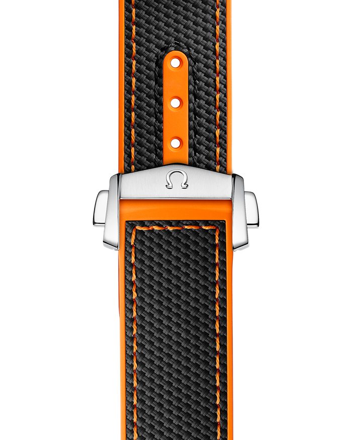Outras caraterísticas incluem um fundo de caixa de rosca alveolado e uma bracelete em borracha estruturada preta com pesponto e forro laranja.