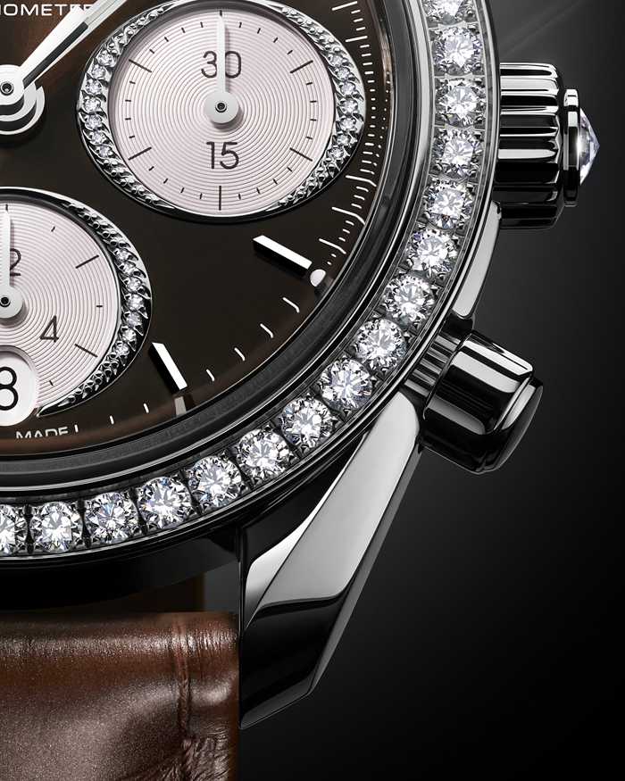 O mostrador em PVD castanho inclui submostradores ovais horizontais com revestimento prateado e uma janela de data oval vertical às 6 horas. Os ponteiros das horas/minutos apresentam um revestimento a ródio polido com diamantes preenchidos com Super-LumiNova branca que emite um brilho verde.