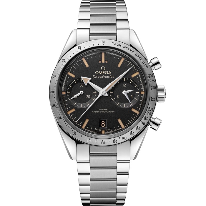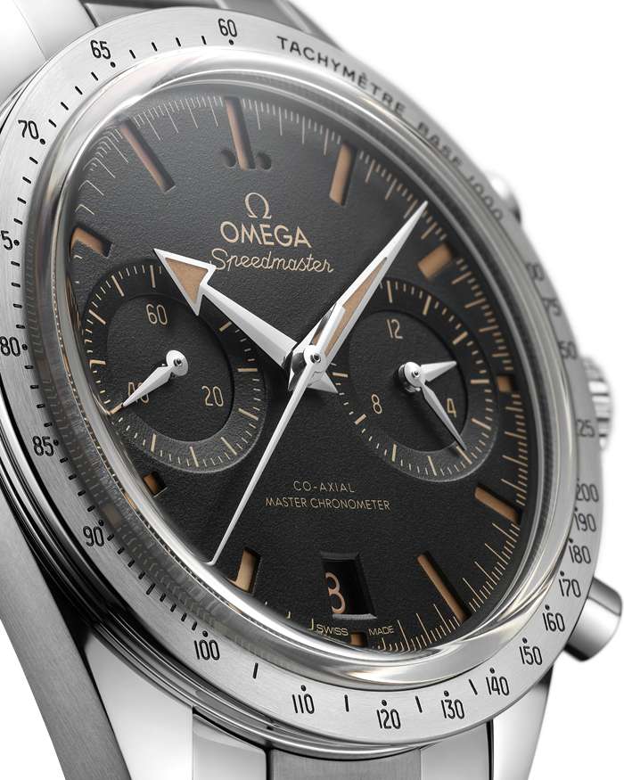 A luneta escovada inclui uma escala taquimétrica escurecida, enquanto o fundo da caixa apresenta a gravação “Speedmaster ‘57’” e um vidro de safira com tratamento antirreflexo no interior.
