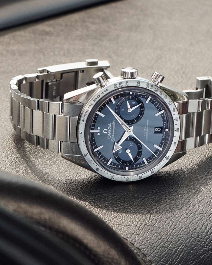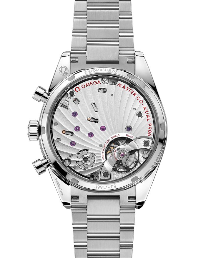 A luneta escovada inclui uma escala taquimétrica escurecida, enquanto o fundo da caixa apresenta a gravação “Speedmaster ‘57’” e um vidro de safira com tratamento antirreflexo no interior.