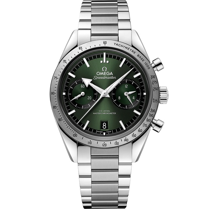 Este modelo de 40,50 mm, inspirado no lendário original de 1957, apresenta uma caixa em aço inoxidável e um mostrador verde com índices revestidos a ródio e ponteiros “Broad Arrow” – todos com Super-LumiNova branca. Possui uma janela de data às 6 horas, um submostrador de pequenos segundos às 9 horas e contadores de cronógrafo de 12 horas e 60 minutos sobre o submostrador às 3 horas.