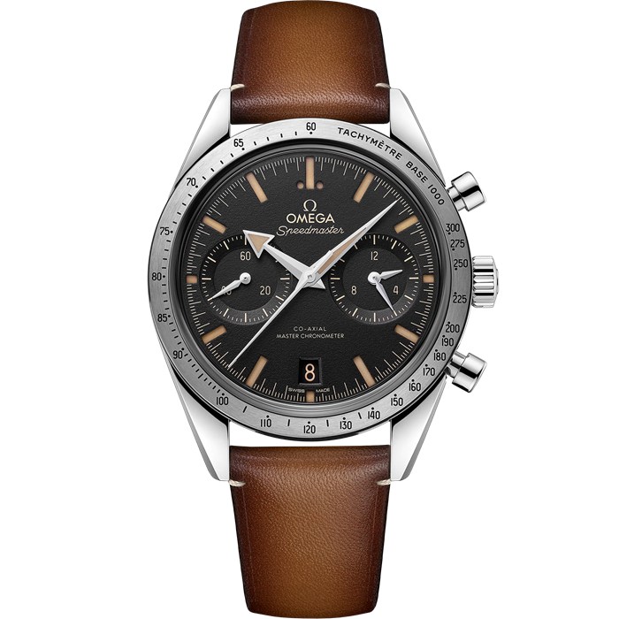 A luneta escovada inclui uma escala taquimétrica escurecida, enquanto o fundo da caixa apresenta a gravação “Speedmaster ‘57’” e um vidro de safira com tratamento antirreflexo no interior.