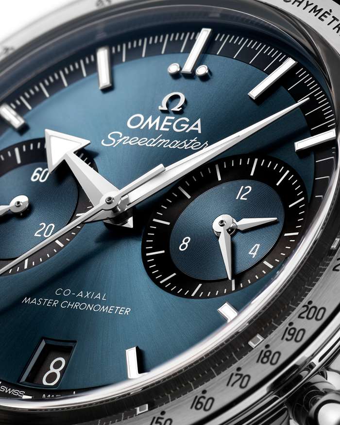 A luneta escovada inclui uma escala taquimétrica escurecida, enquanto o fundo da caixa apresenta a gravação “Speedmaster ‘57’” e um vidro de safira com tratamento antirreflexo no interior.