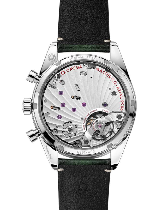 A luneta escovada inclui uma escala taquimétrica escurecida, enquanto o fundo da caixa apresenta a gravação “Speedmaster ‘57’” e um vidro de safira com tratamento antirreflexo no interior.