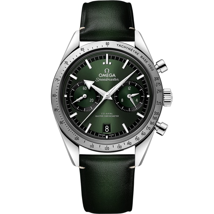 Este modelo de 40,50 mm, inspirado no lendário original de 1957, apresenta uma caixa em aço inoxidável e um mostrador verde com índices revestidos a ródio e ponteiros “Broad Arrow” – todos com Super-LumiNova branca. Possui uma janela de data às 6 horas, um submostrador de pequenos segundos às 9 horas e contadores de cronógrafo de 12 horas e 60 minutos sobre o submostrador às 3 horas.