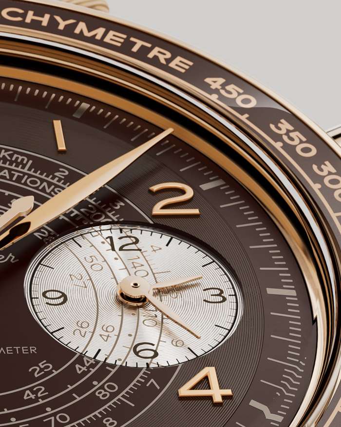 De forma mais notável, o mostrador é impresso com três escalas de tempo distintas num design “caracol” dos anos 40, incluindo uma escala taquimétrica, uma escala pulsimétrica e uma escala telemétrica.