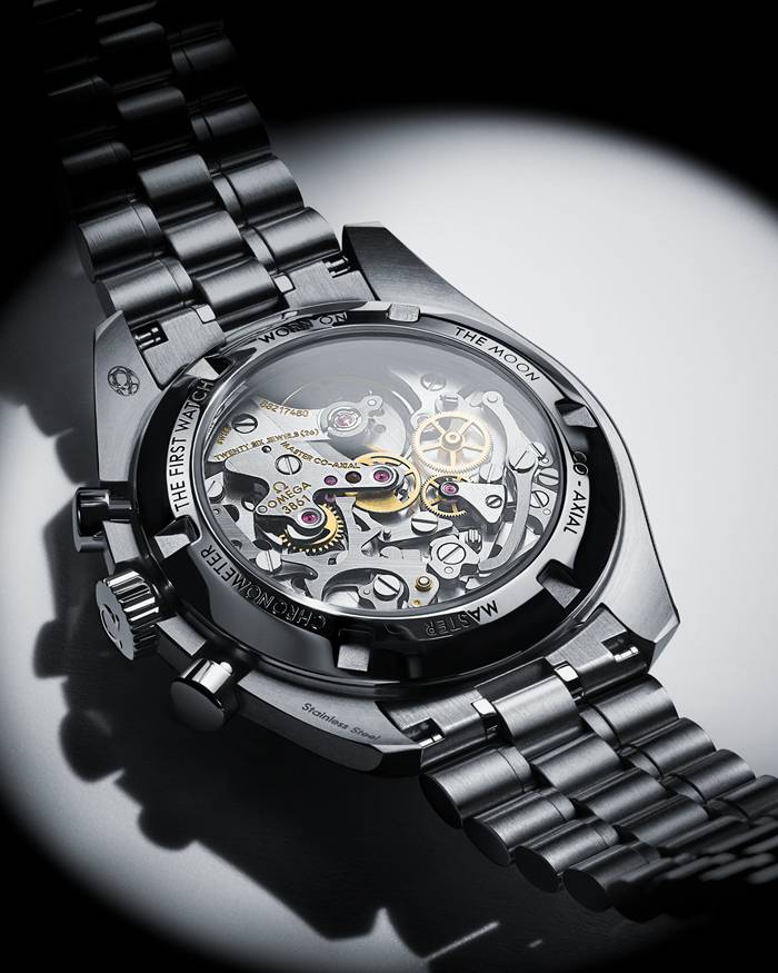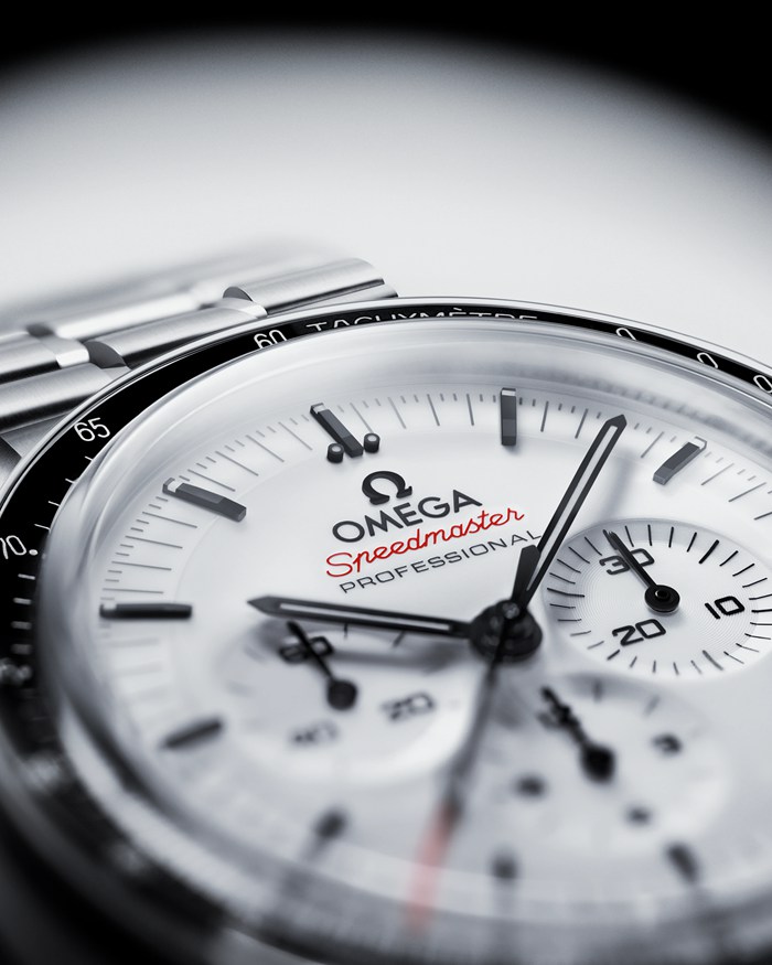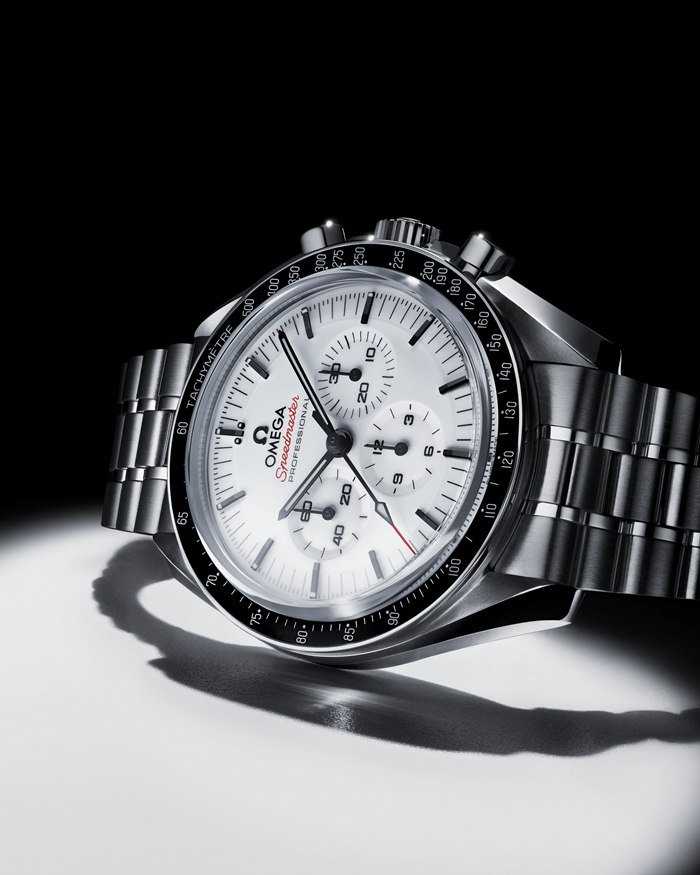 Apresentado com uma bracelete polida e escovada, este Moonwatch de 42 mm em aço inoxidável possui vidro de safira na parte da frente e também no fundo da caixa. Inspirado no estilo do Speedmaster de 4.ª geração usado na Lua, também inclui uma caixa assimétrica, um mostrador escalonado lacado branco com logótipo e índices OMEGA aplicados, ponteiros estilo Moonwatch e o famoso ponto sobre o número 90 na luneta em alumínio anodizado preto.