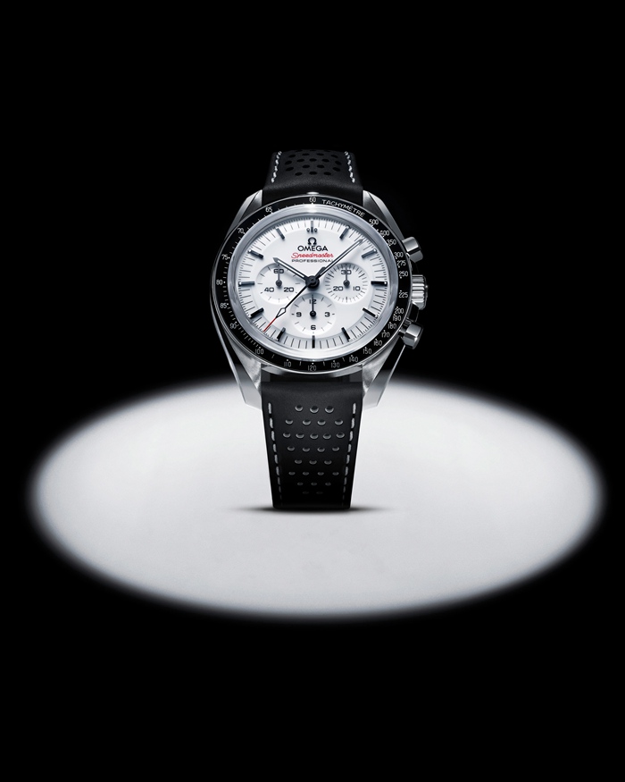 Apresentado com uma bracelete em pele preta microperfurada com pespontos vermelhos e brancos, este Moonwatch de 42 mm em aço inoxidável possui vidro de safira na parte da frente e também no fundo da caixa. Inspirado no estilo do Speedmaster de 4.ª geração usado na Lua, também inclui uma caixa assimétrica, um mostrador escalonado lacado branco com logótipo e índices OMEGA aplicados, ponteiros estilo Moonwatch e o famoso ponto sobre o número 90 na luneta em alumínio anodizado preto.