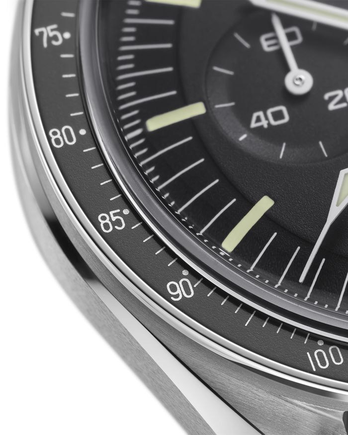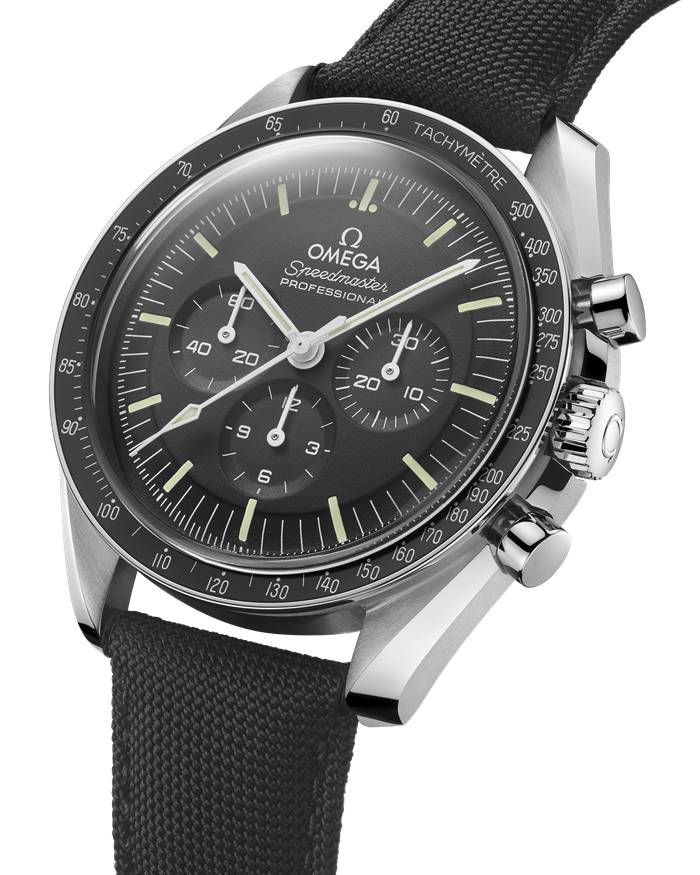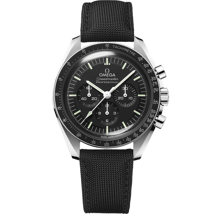Apresentado com uma bracelete em tecido de nylon, este Moonwatch de 42 mm em aço inoxidável possui vidro de hesalite na parte da frente e o medalhão do cavalo marinho gravado em relevo no fundo da caixa. Inspirado no estilo do Speedmaster de 4.ª geração usado na Lua, também inclui uma caixa assimétrica, um mostrador escalonado preto e o famoso ponto sobre o número 90 na luneta em alumínio anodizado.